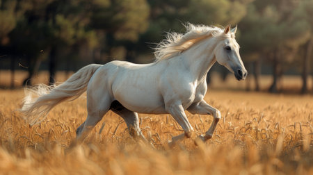 A majestic white horse with a flowing mane gallops through a golden wheat field under a bright blue sky. The dynamic motion of the horses contrasts beautifully with the serene rural landscape, capturing the essence of freedom and natural beauty. Trees line the horizon, enhancing the peaceful countryside setting