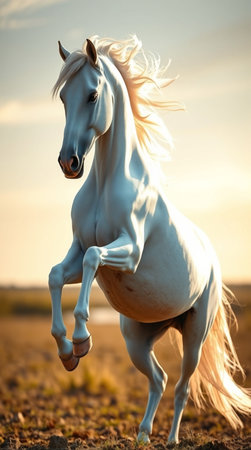 A stunning portrayal of a white horse in a dynamic rearing position, set against a minimal background, showcasing its grace and elegance in motion.