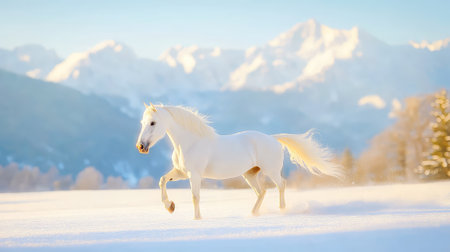 A stunning image of a graceful white horse galloping across a snowy landscape, accompanied by majestic mountains in the background, capturing the essence of winter serenity.