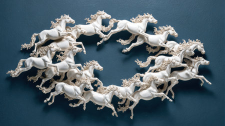 A series of white horses in mid-gallop are arranged in a circular formation against a deep blue wall, showcasing movement and artistry.