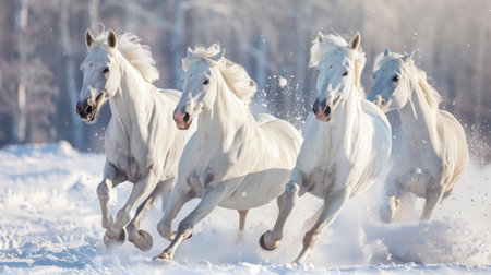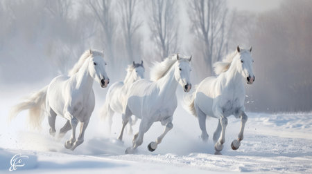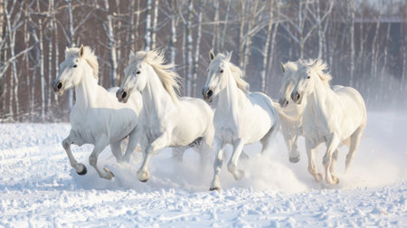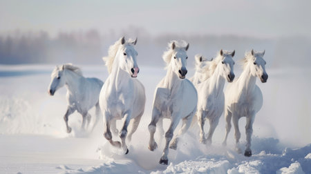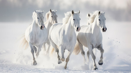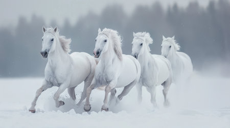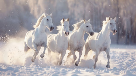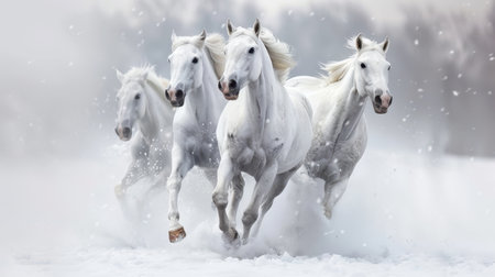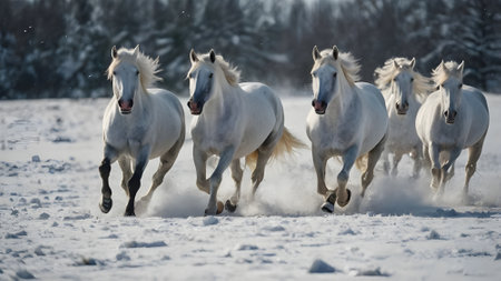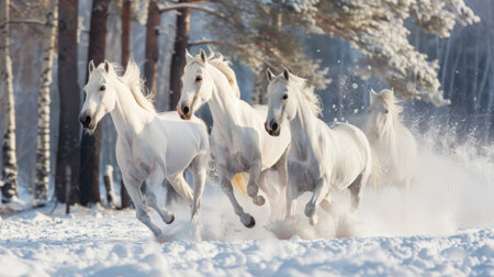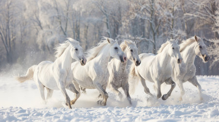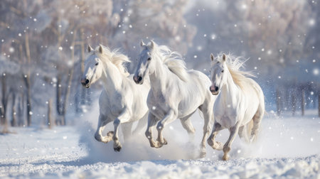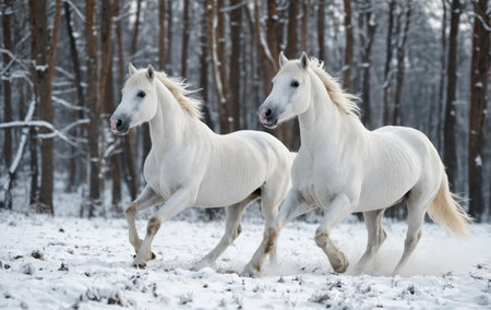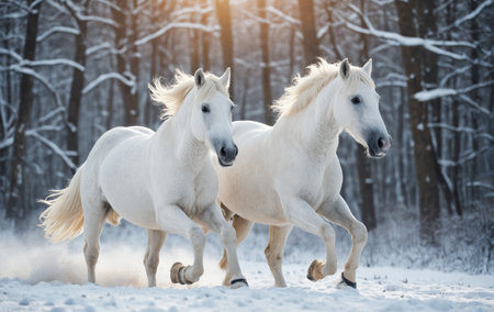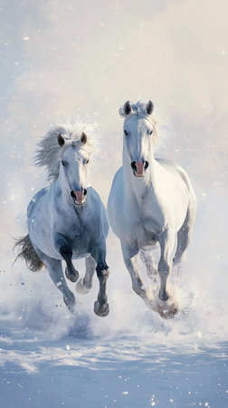 This heart-stirring image captures the splendor of two white horses galloping freely amidst a snowy backdrop. Their lively motion is a testament to the zen-like calm of a hushed winter day.