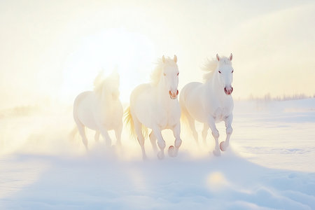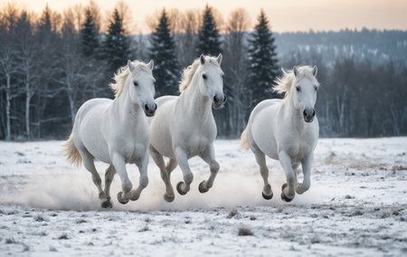 Three majestic white horses run energetically towards the viewer across a snow-covered field at dawn.