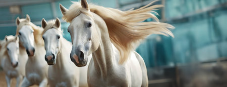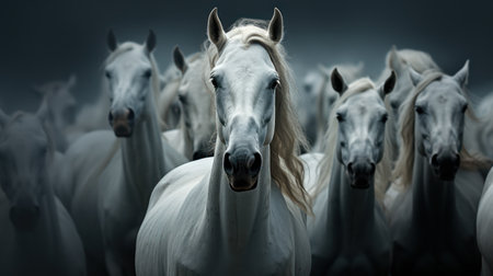 A striking close-up showcases a herd of pure white horses. The image is characterized by soft lighting and a predominantly cool color palette. The horses' flowing manes and expressive faces add depth and visual interest. Suitable for various creative and commercial applications.