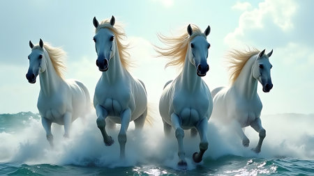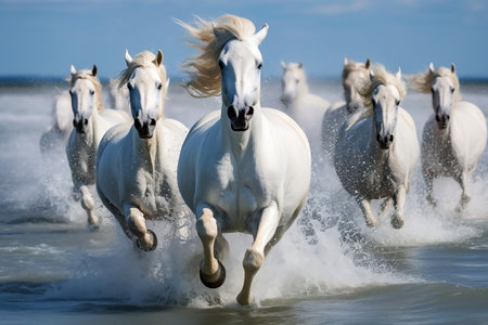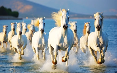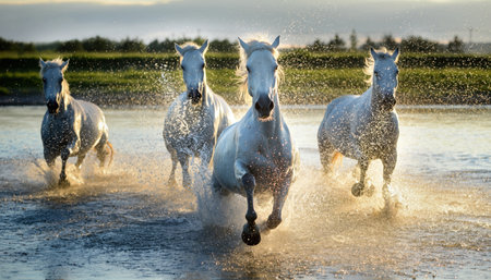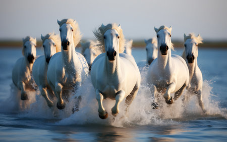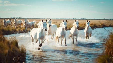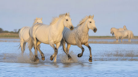 Herd of Powerful and Elegant White Horses Galloping Through the Serene Wetlands of the Camargue Region in Southern France Creating a Breathtaking and Atmospheric Natural Scene
