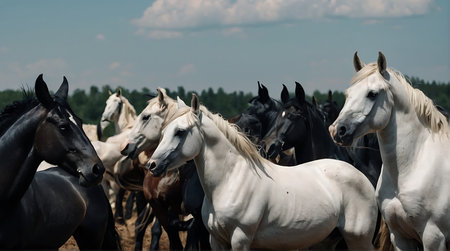 A group of horses are presented in monochrome with a black horse in focus. The image uses high-key lighting, enhancing the texture of the animals. The composition appears artistic, suitable for various uses, including editorial and commercial projects. The scene takes place in an open environment.