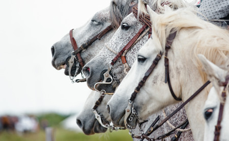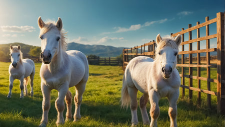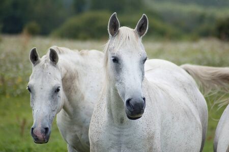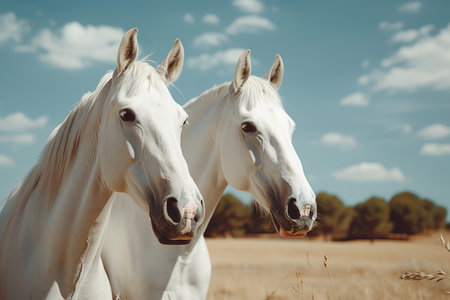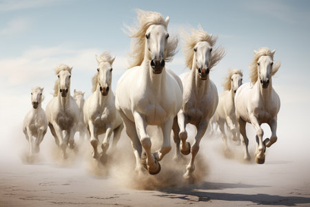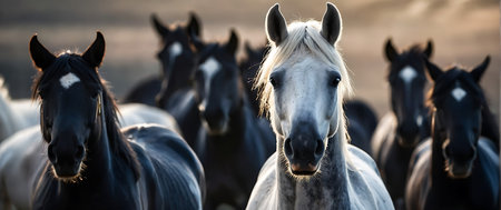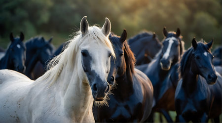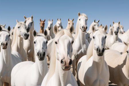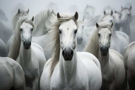 A striking composition features a herd of white horses, captured with a shallow depth of field. The image highlights the horses' white coats and their attentive expressions. The soft lighting suggests an outdoor setting. Suitable for various uses, this image could be used in editorial or advertising content.