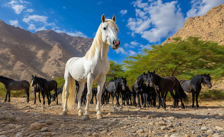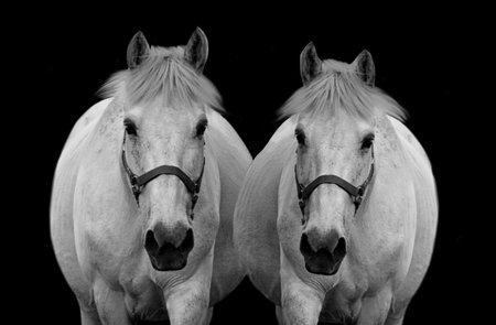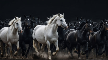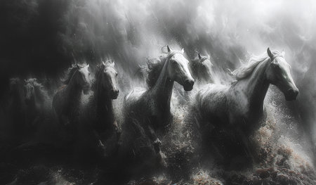 A striking visual features a group of horses with a predominantly grayscale palette. The image showcases the animals in a dynamic pose, their forms highlighted by contrasting tones and textures. This artistic composition is suitable for various commercial uses, including advertising campaigns and editorial projects.