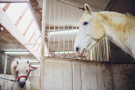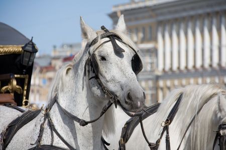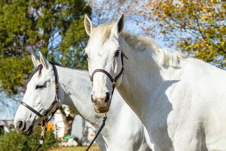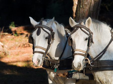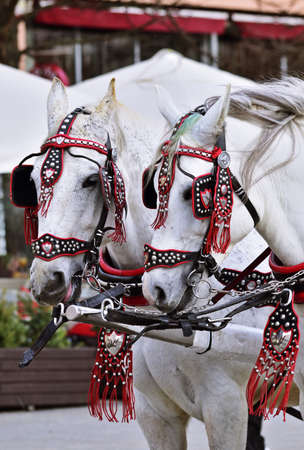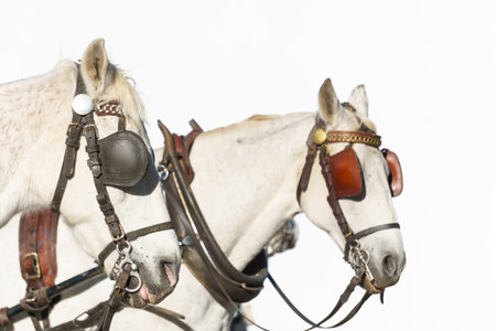 Two white horses wearing bridles and harness equipment, ready for pulling a carriage, symbolizing teamwork and tradition