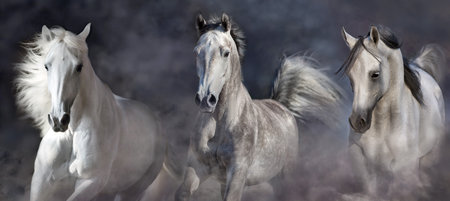 A herd of white horses gallops through a misty, outdoor environment. The image displays the animals in motion with flowing manes and tails. The color palette consists of neutral tones and textures. This image may be suitable for advertising, editorial, or design projects.