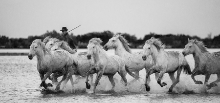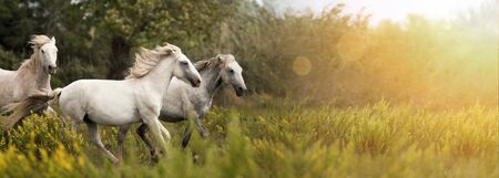 White Camargue Horses run in the swamps nature reserve. Parc Regional de Camargue. France. Provence. An excellent illustration