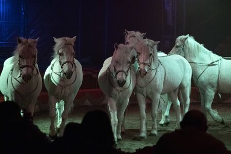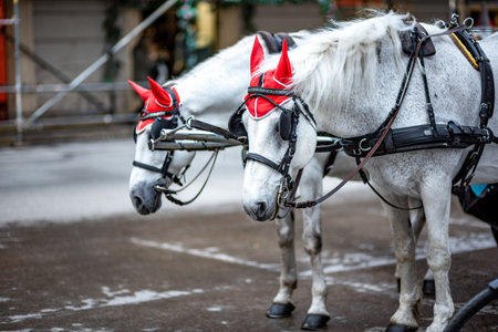 White Lipizzaner tourist chariot horses, trained in the Spanish Riding School in Vienna, capital of Austria on 2 May 2023