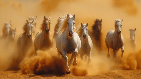 Horses with long mane portrait run gallop in desert dust Generative AI