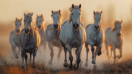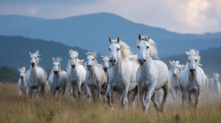 A group of majestic white horses moves through a misty landscape as dawn breaks, their manes flowing in the gentle breeze, creating a serene and ethereal atmosphere.