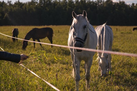 Beautiful horses in a herd on a sunny day. Selective focus.