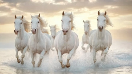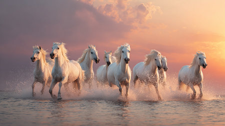 A group of four majestic white horses running through a shallow body of water, kicking up spray, during a beautiful sunset.