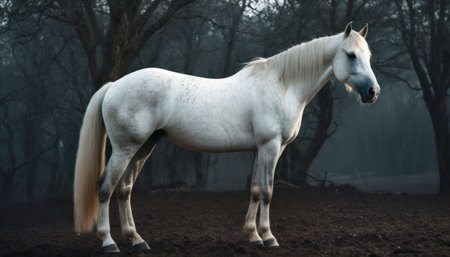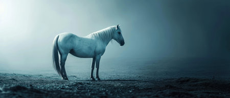 A striking image presents a herd of white horses amidst a misty, dark environment. The horses, with flowing manes, stand out with their bright coats. The composition employs a shallow depth of field, with soft focus and muted tones, suggesting a tranquil and evocative scene. Suitable for a variety of editorial and commercial projects.