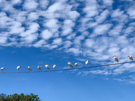 White Ibis birds sitting in a group on wire with blue sky