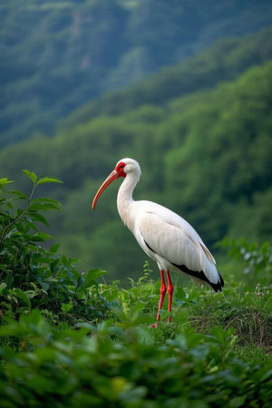Beautiful white ibis standing on the edge of a green meadow