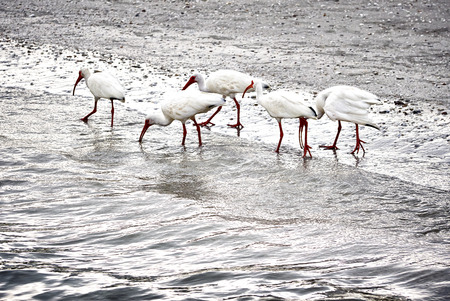 White ibis bird in shallow beach waters along the coast.