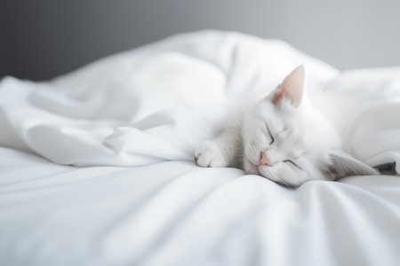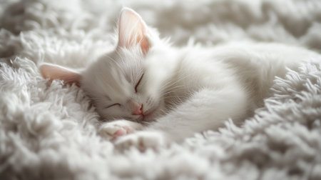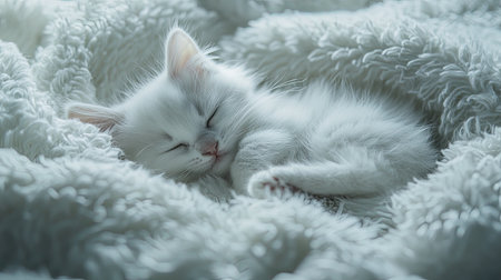 A charming white kitten peacefully sleeping on a soft, cozy blanket, showcasing its fluffy fur and serene expression in a tranquil setting.