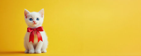 Kitten cat with white fur and blue eyes wearing red bow sitting against yellow background. Cute pet animal in festive ribbon concept.
