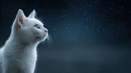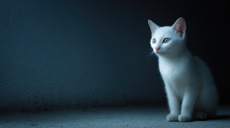 This captivating image features a curious white cat seated quietly in low light, showcasing soft shadows and gentle highlights that emphasize its innocent demeanor.