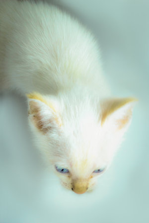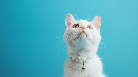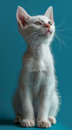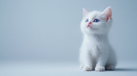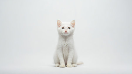 This cute white cat sits gracefully in a clean studio environment, showcasing its playful and curious personality, perfect for any pet lover's collection.