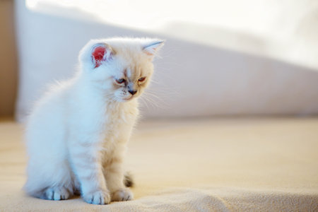 Adorable Fluffy Kitten Resting on Cozy White Blanket at Home in Bright Lighting