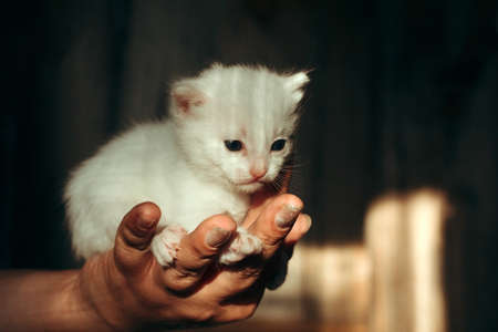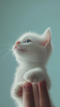 White kitten held in hand against soft blue background, serene and gentle pet concept