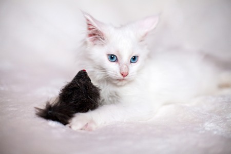 A charming playful exotic shorthair kitten with white fur engages with a soft toy, capturing its innocence and curiosity in a serene indoor setting.