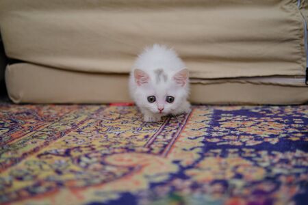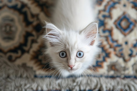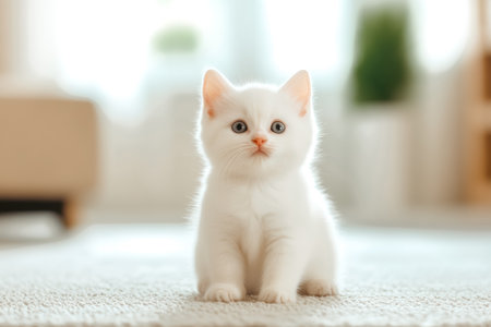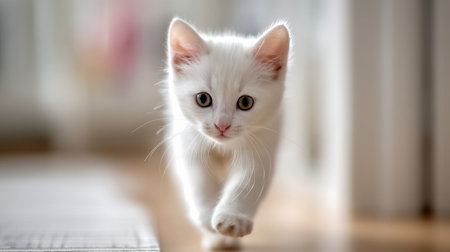 A charming white kitten with vivid, captivating eyes strides confidently towards the camera, illuminated by gentle indoor lighting that highlights its playful spirit and i