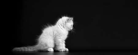 Funny Kitten on a black background, black and white portret. Small fluffy kitten of the Neva masquerade cat (subspecies of the Siberian cat)