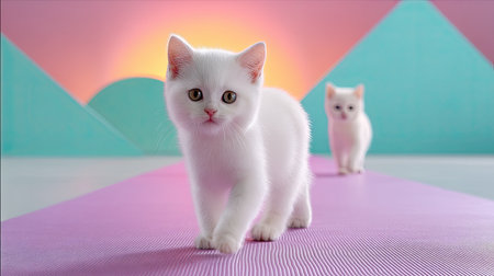 Two cute white kittens walk on a yoga mat in a colorful and softly lit indoor setting, radiating joy and playfulness, ideal for animal lovers and photography.