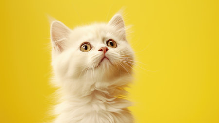 the cat looks up on a yellow background, front view. Cute young cat looks great