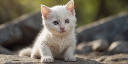 A beautiful white cat with striking blue eyes sits gracefully in a serene setting. Its soft, fluffy fur and gentle expression radiate calmness and charm.
