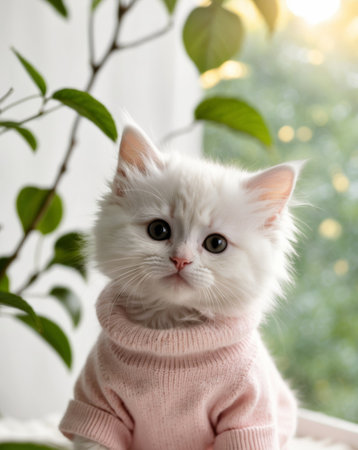 AI Generated. Cute kitten in a pink sweater on the background of nature