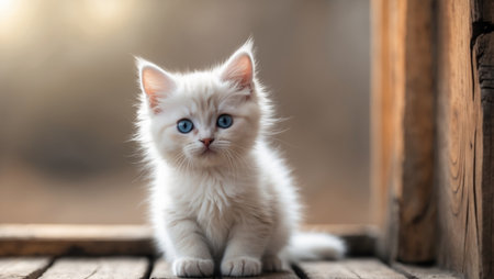 AI Generated. Curious Kitten with Blue Eyes on Wooden Surface