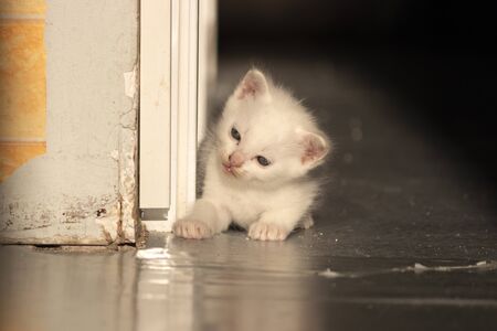 Sick little white kitten with feline panleukopenia lying on the floor with sad eyes and some vomit on her fluffy hair.