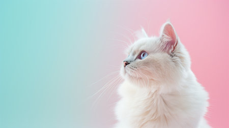 Side profile of a white cat with blue eyes, looking thoughtfully against a pastel gradient background.
