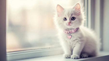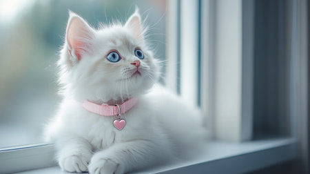 A fluffy white kitten wearing a pastel pink collar with a tiny heart charm, sitting on a windowsill and gazing outside with wide, innocent eyes.