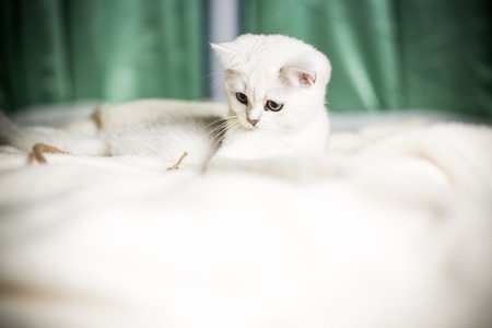 Cute white kitten sleeping on a soft blanket. Selective focus.