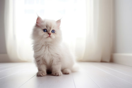 Fluffy white kitten with blue eyes exploring indoors on wooden floor.