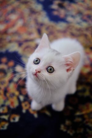 Ginger white fluffy kitten looking upwards, curious playful expression. Carpet living room background