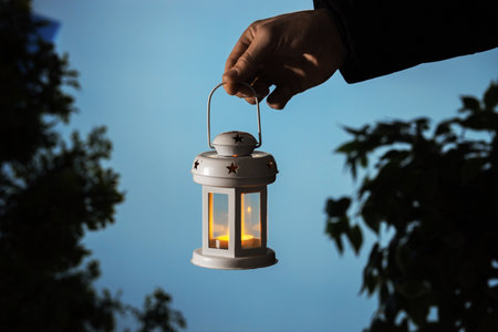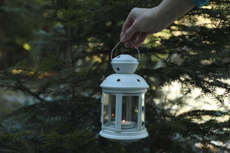 Woman holding Christmas lantern with burning candle in evening, closeup