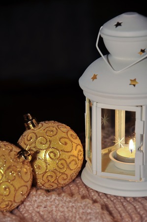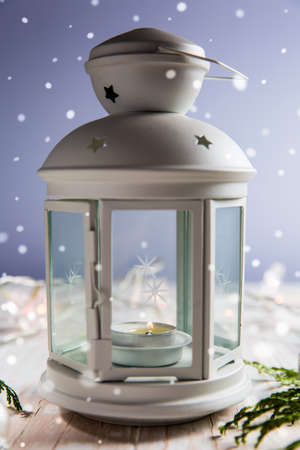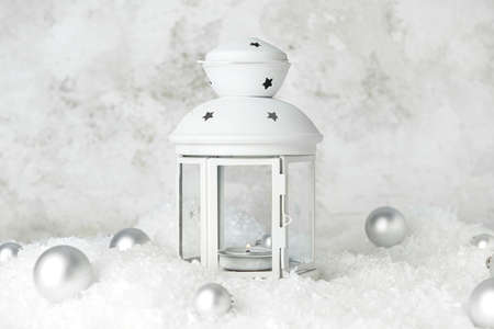 Beautiful Christmas lantern with burning candle, snow and balls on light background