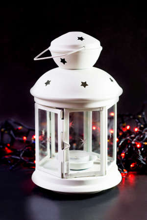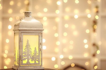 christmas lantern. Christmas interior decorated with lights garland. copy space