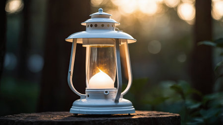 A white lantern sits on a wooden stump, casting a warm glow as the sun sets in the background. The surrounding trees create a serene atmosphere in nature.