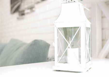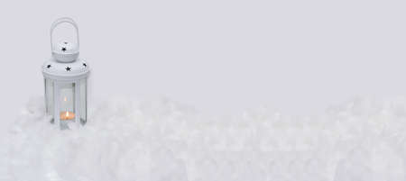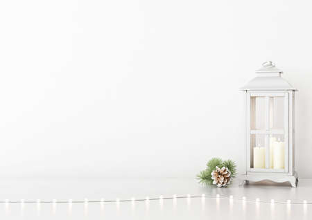 Interior white wall mock up with candle lantern, garland lights and christmas decoration on empty background. 3D rendering.