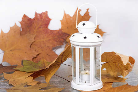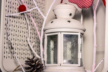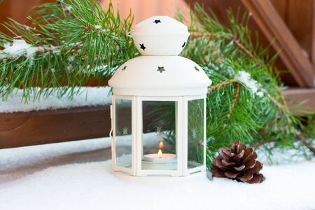 Christmas decoration with a white lantern and burning candles on the table with fir branches
