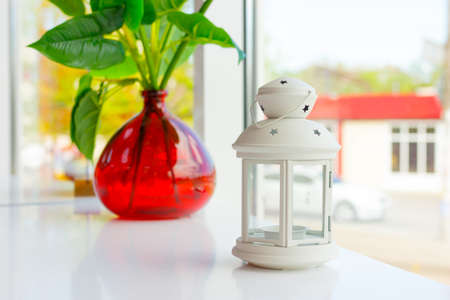 seedlings white candlesticks red glass vase for flowers on the background of the window